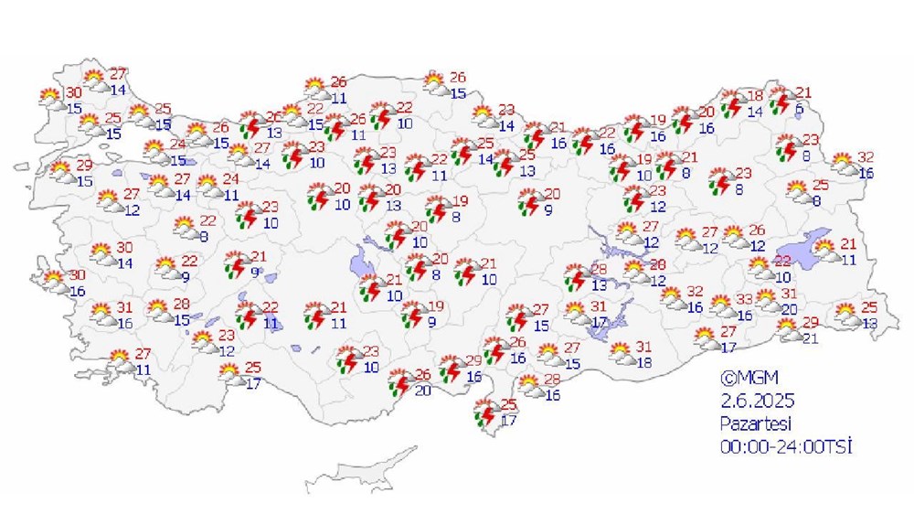 2 Haziran Pazartesi günü İstanbul 25, Ankara 20, İzmir 30, Antalya 25, Diyarbakır 32, Trabzon 19, Erzurum 23 derece.