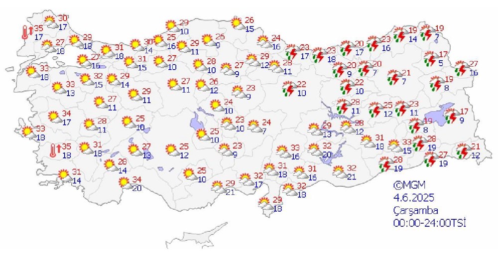 4 Haziran Çarşamba günü İstanbul 29, Ankara 27, İzmir 33, Antalya 34, Diyarbakır 31 , Trabzon 20, Erzurum 21 derece.