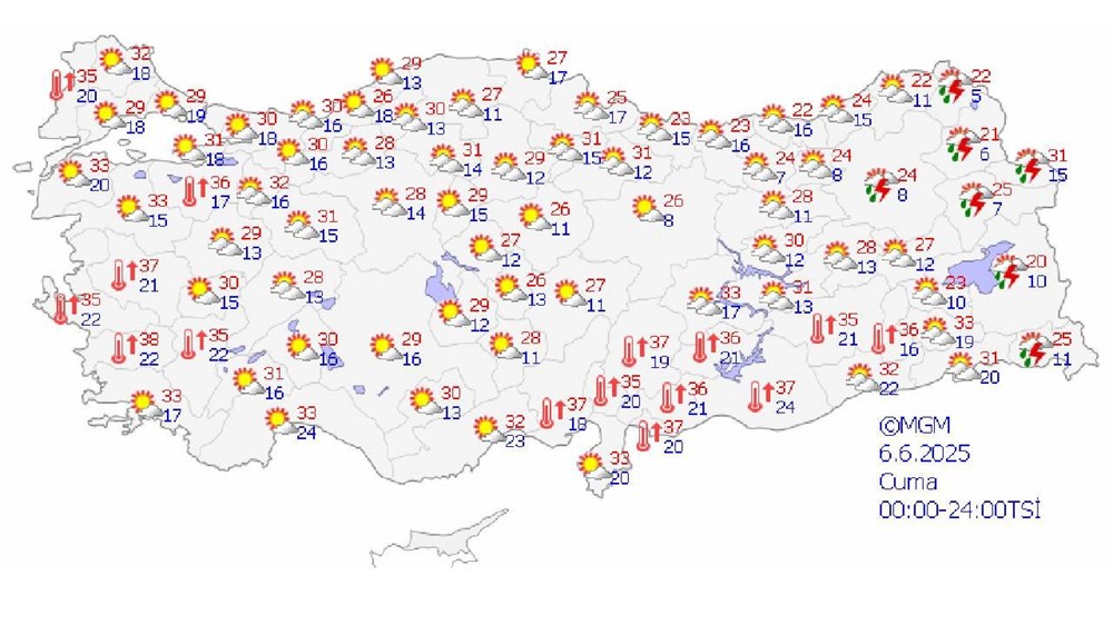 Kurban Bayramı’nın ilk günü; 6 Haziran Cuma İstanbul 29, Ankara 28, İzmir 35, , Antalya 33, Diyarbakır 35, Trabzon 22, Erzurum 24 derece.