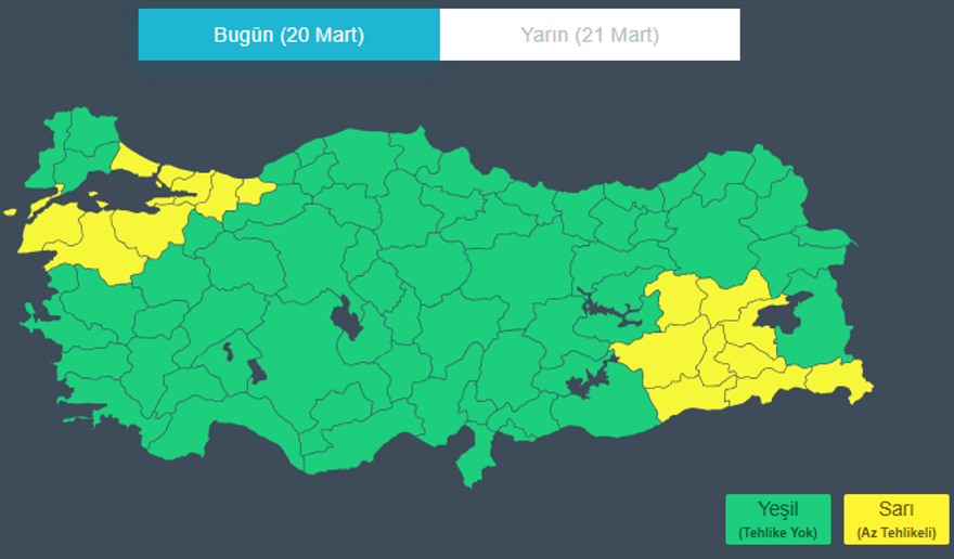 Meteoroloji Genel Müdürlüğü tarafından bugün Balıkesir, Bingöl, Bitlis, Bursa, Çanakkale, Diyarbakır, Hakkari, İstanbul, Kocaeli, Mardin, Muş, Sakarya, Siirt, Batman, Şırnak, Yalova ve Düzce için sarı kodlu kuvvetli yağış uyarısı yapıldı.