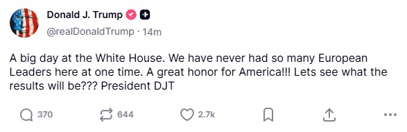 Trump, “Ukrayna Cumhurbaşkanı Volodimir Zelenskiy, Fransa Cumhurbaşkanı Emmanuel Macron, Finlandiya Cumhurbaşkanı Alexander Stubb, İtalya Başbakanı Giorgia Meloni, Birleşik Krallık Başbakanı Keir Starmer, Almanya Federal Cumhuriyeti Şansölyesi Friedrich Merz, Avrupa Komisyonu Başkanı Ursula von der Leyen ve NATO Genel Sekreteri Mark Rutte ile Beyaz Saray’da çok verimli bir toplantı gerçekleştirdim” ifadelerini kullandı.