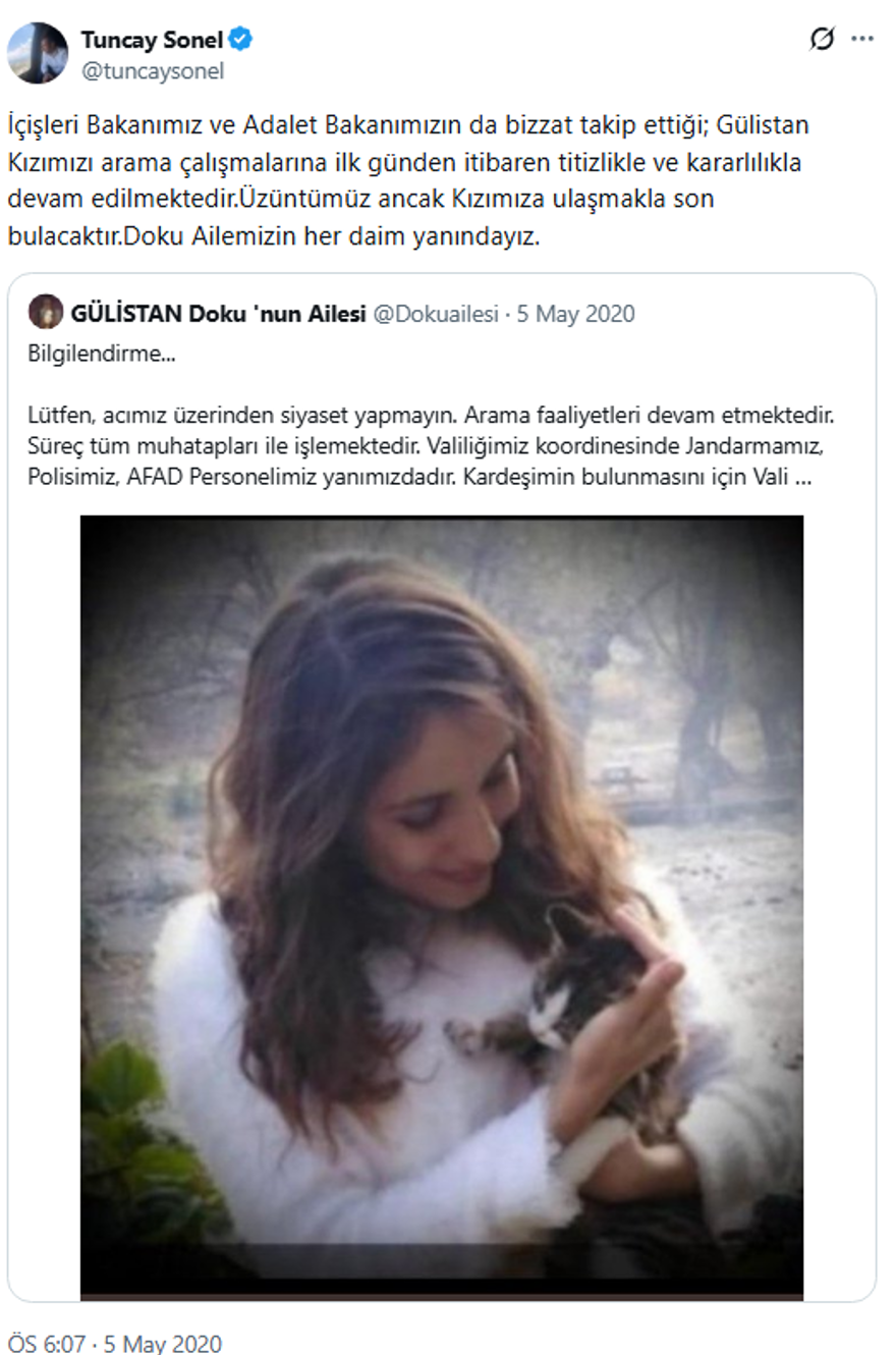 21 Mart 2020’de bulunan kadın cesedini Doku ailesi değil Tuncay Sonel teşhis etti. Sonel, henüz otopsi yapılmadan “Bu Gülistan değil” dedi. Cansız bedeni bulunan kişi ise iki haftadır kayıp olan Esma Kılıçarslan’dı.