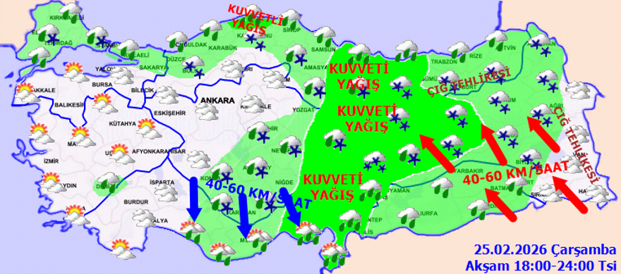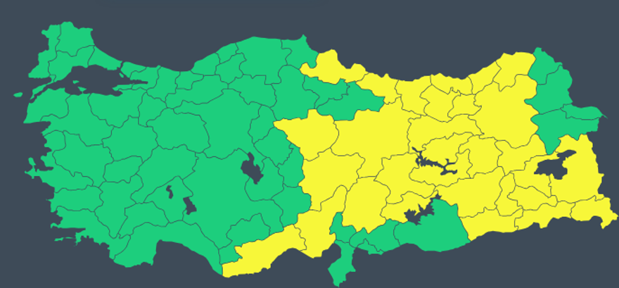 MGM; Adıyaman, Artvin, Bingöl, Bitlis, Diyarbakır, Elazığ, Erzincan, Erzurum, Giresun, Gümüşhane, Hakkari, Kayseri, Malatya, Kahramanmaraş, Muş, Ordu, Rize, Samsun, Siirt, Sivas, Trabzon, Tunceli, Van, Yozgat, Bayburt, Batman ve Şırnak’a sarı kodla yoğun kar uyarısı yayınladı.