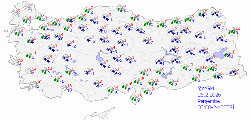 MGM’nin yayınladığı uyarıya göre 26 Şubat – 05 Mart 2026 arasında beklenen en düşük hava sıcaklıkları şöyle olacak: