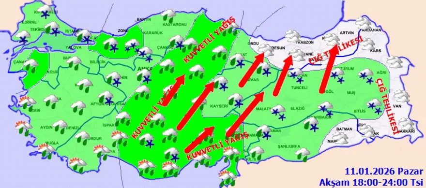 Yağışların Marmara’nın güney ve doğusu, Ege (İzmir ve Manisa hariç), Akdeniz, İç Anadolu, Batı Karadeniz ile Amasya, Samsun ve Çorum çevrelerinde yerel kuvvetli olacağını bildiren MGM, ani sel, su baskını, yıldırım, yerel küçük çaplı dolu ve ulaşımda aksamalar gibi olumsuzluklara karşı dikkatli ve tedbirli olunması gerektiğini açıkladı.