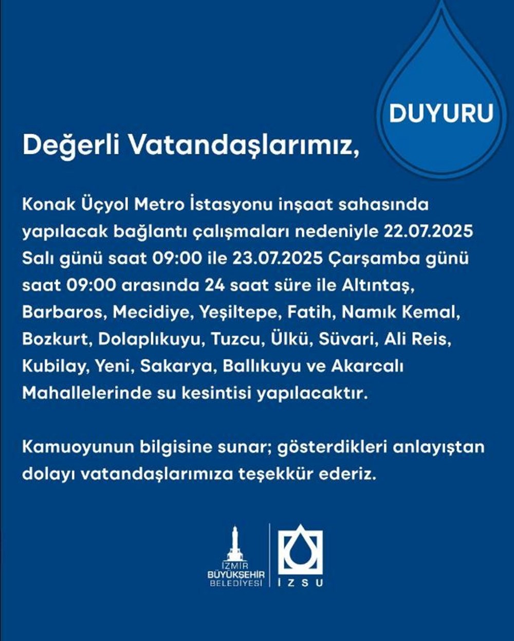 Konak Üçyol Metro İstasyonu inşaat sahasında yapılacak bağlantı çalışmaları nedeniyle 22.07.2025 Salı günü saat 09:00 ile 23.07.2025 Çarşamba günü saat 09:00 arasında 24 saat süre ile Altıntaş, Barbaros, Mecidiye, Yeşiltepe, Fatih, Namık Kemal, Bozkurt, Dolaplıkuyu, Tuzcu, Ülkü, Süvari, Ali Reis, Kubilay, Yeni, Sakarya, Ballıkuyu ve Akarcalı