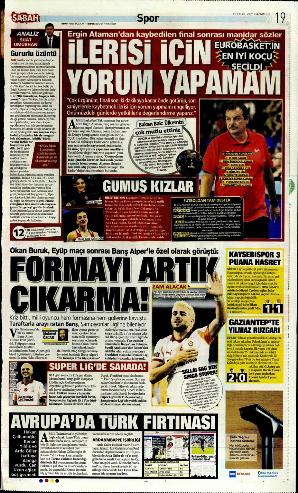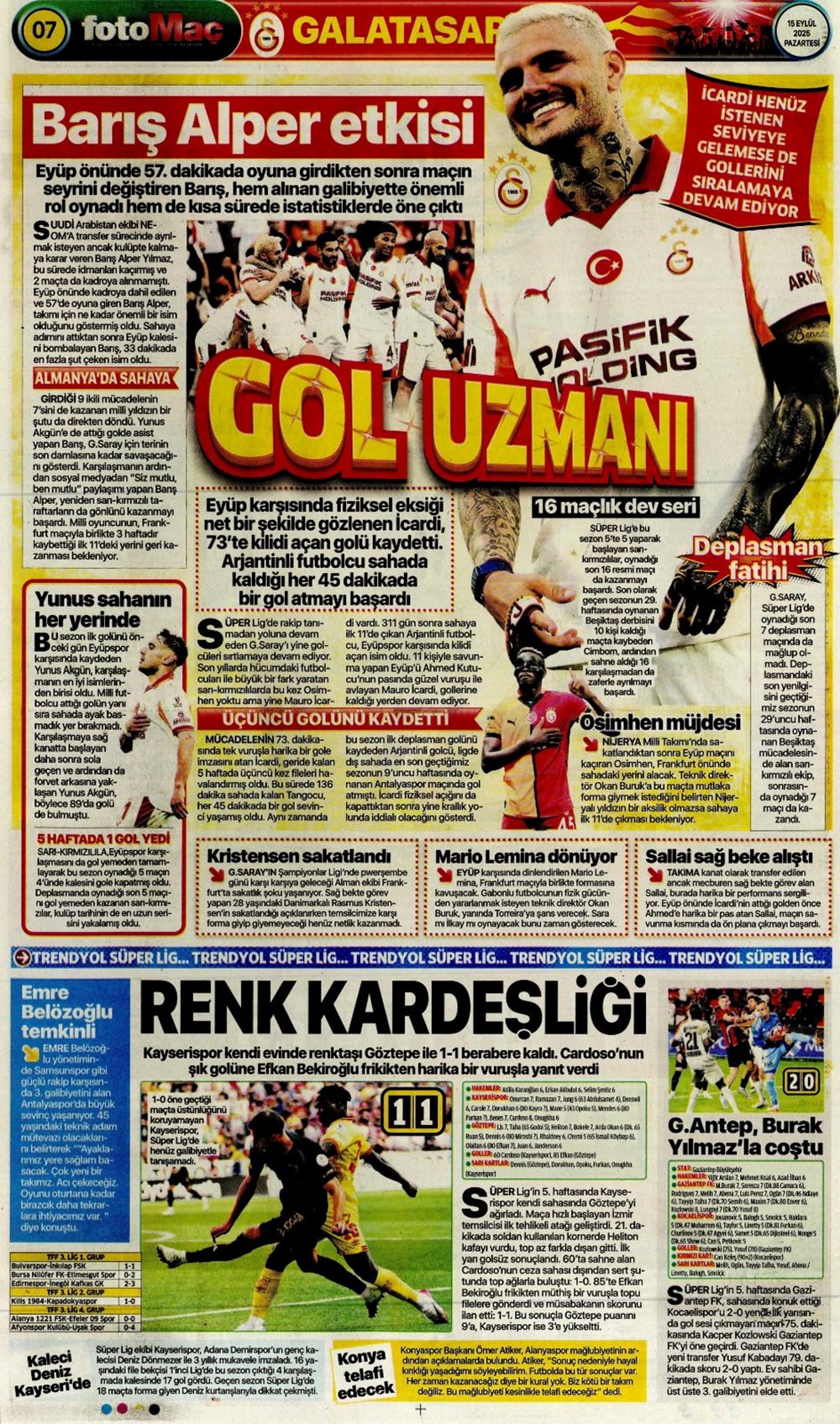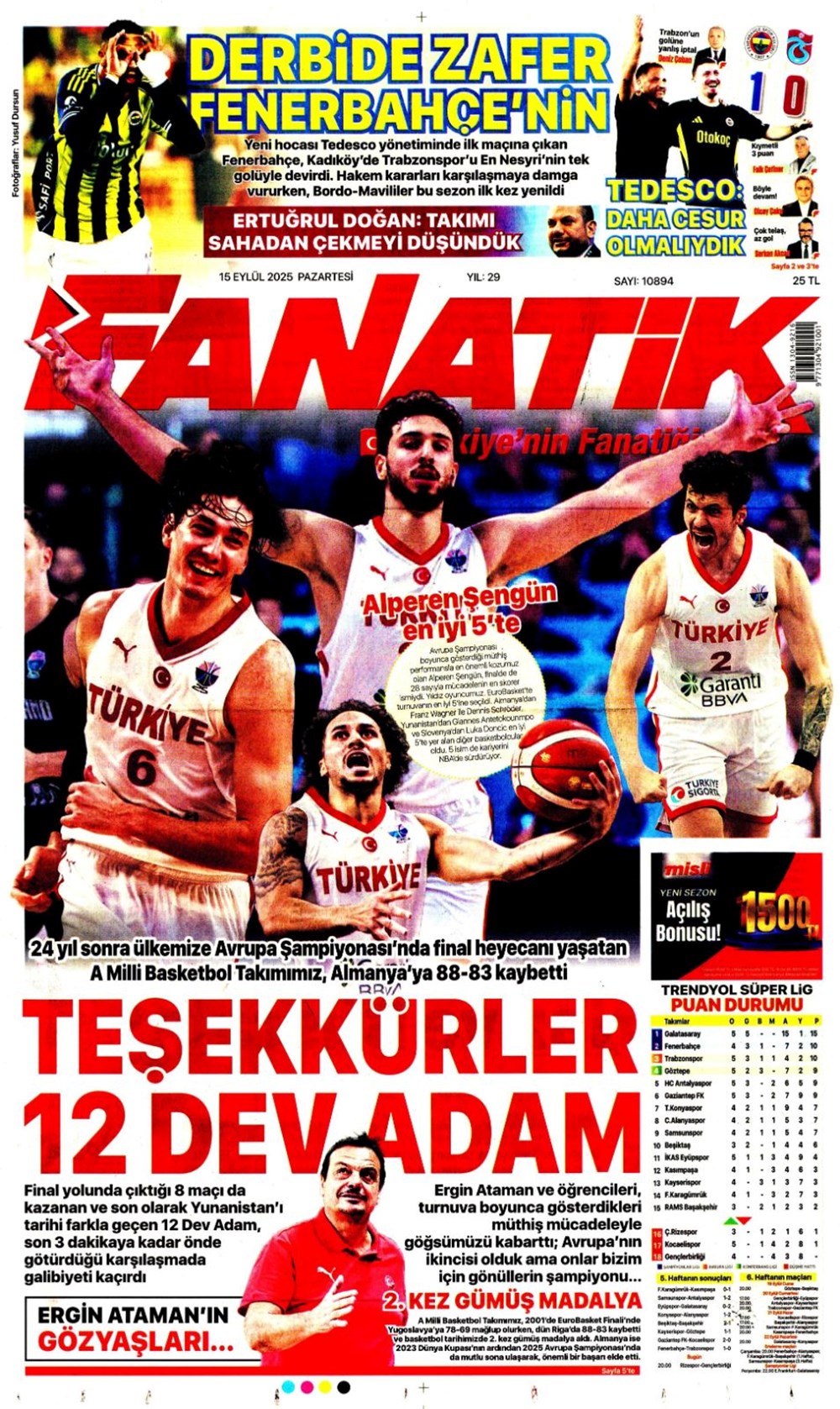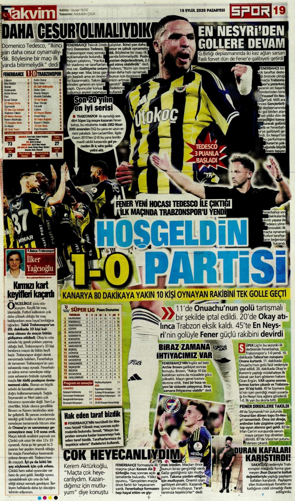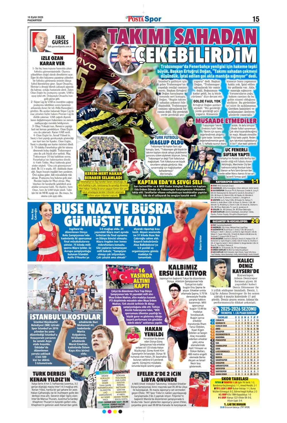 “Kadıköy’de hoşgeldin partisi” (15 Eylül spor manşetleri)