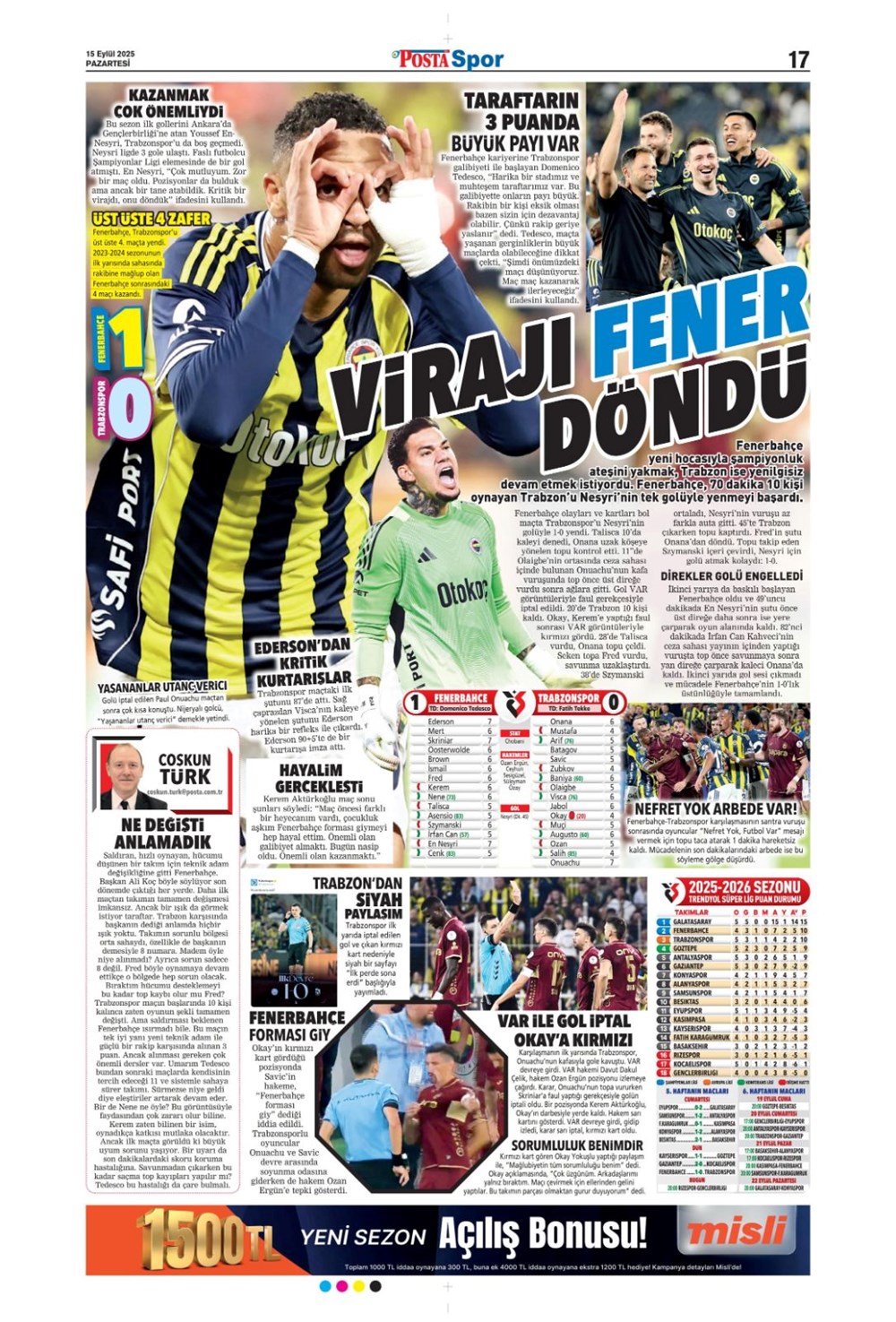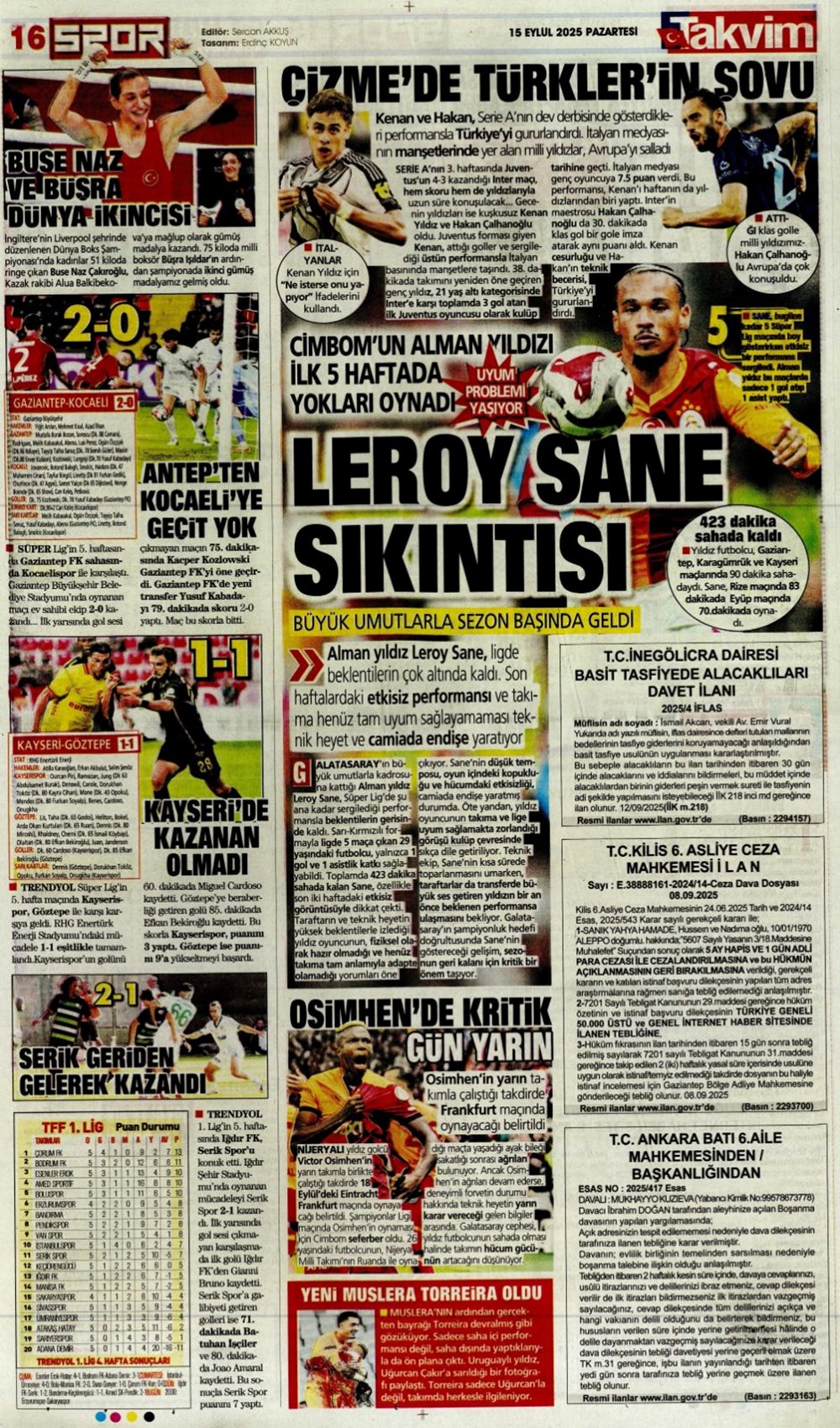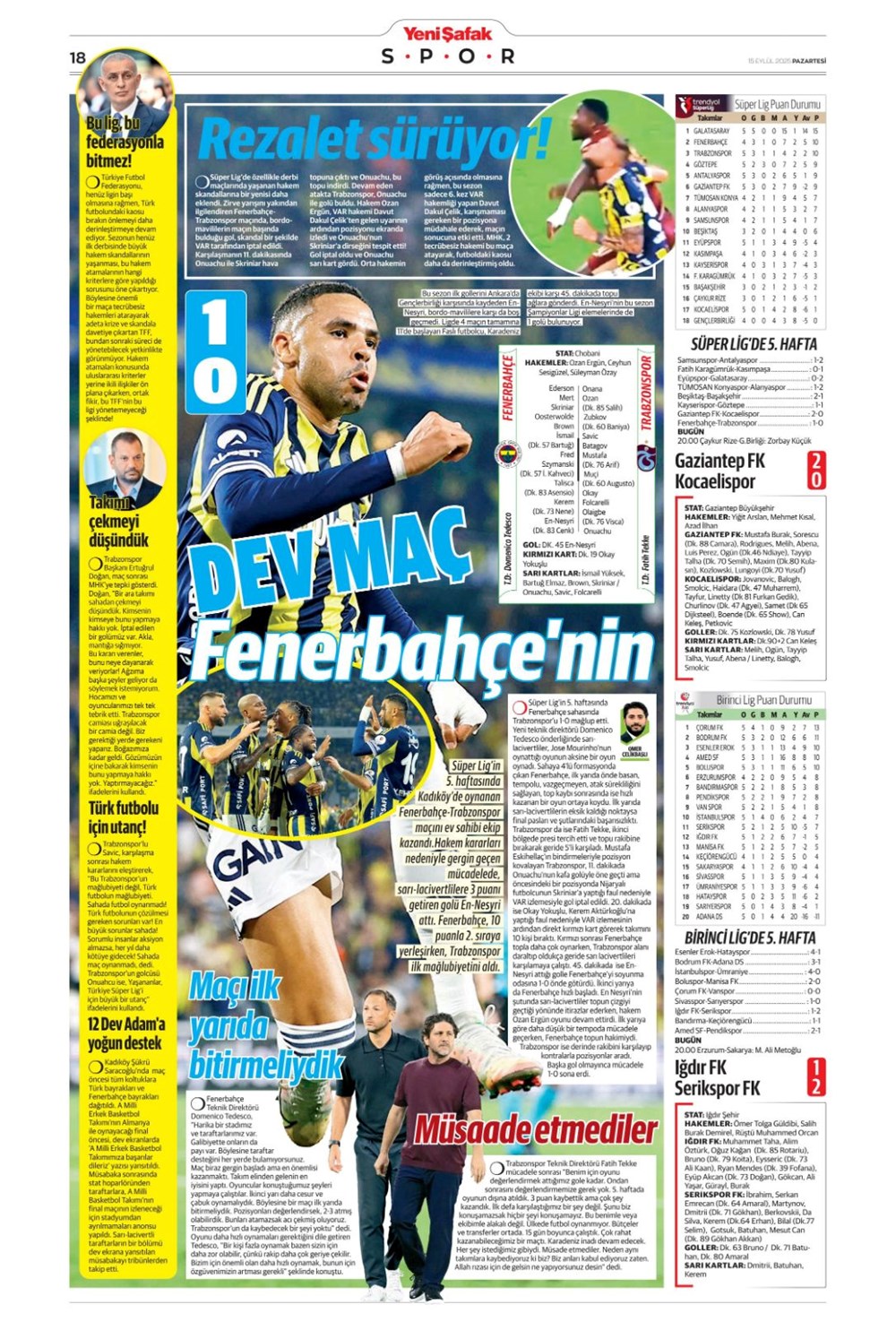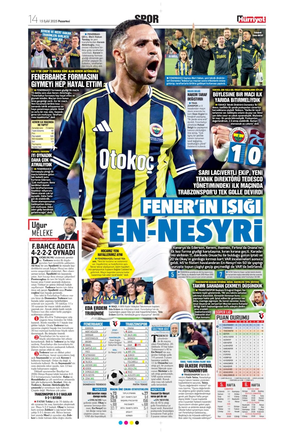 “Kadıköy’de hoşgeldin partisi” (15 Eylül spor manşetleri)