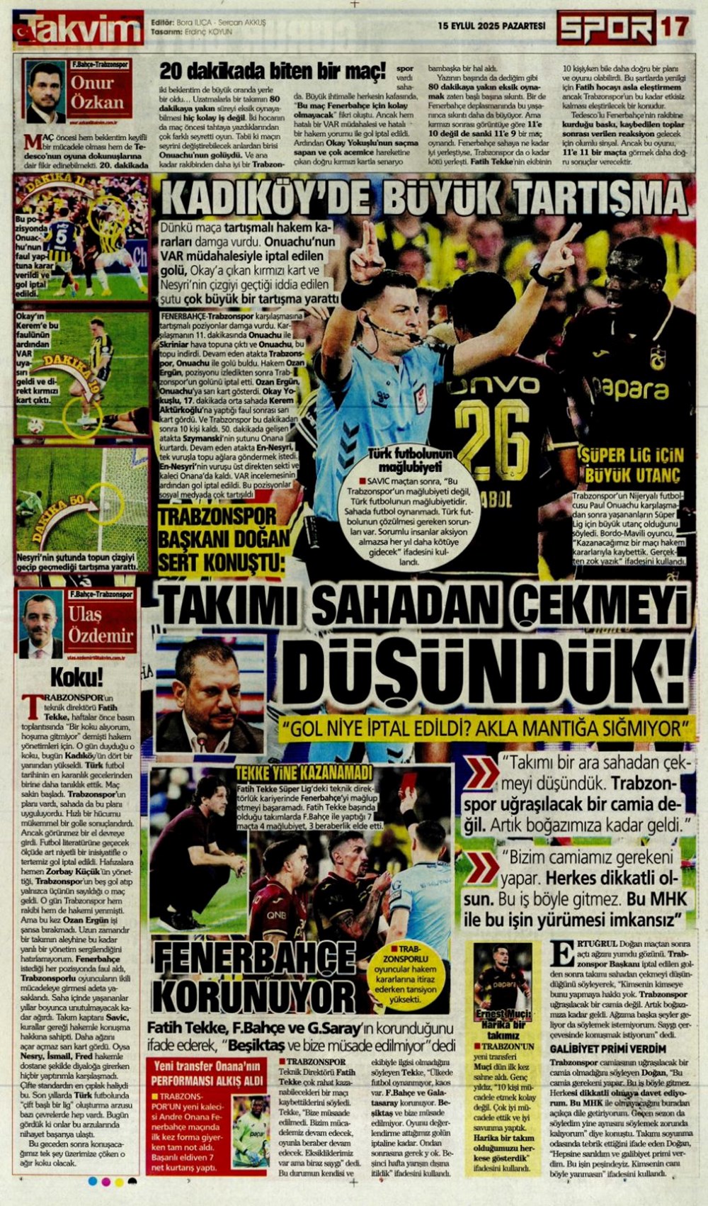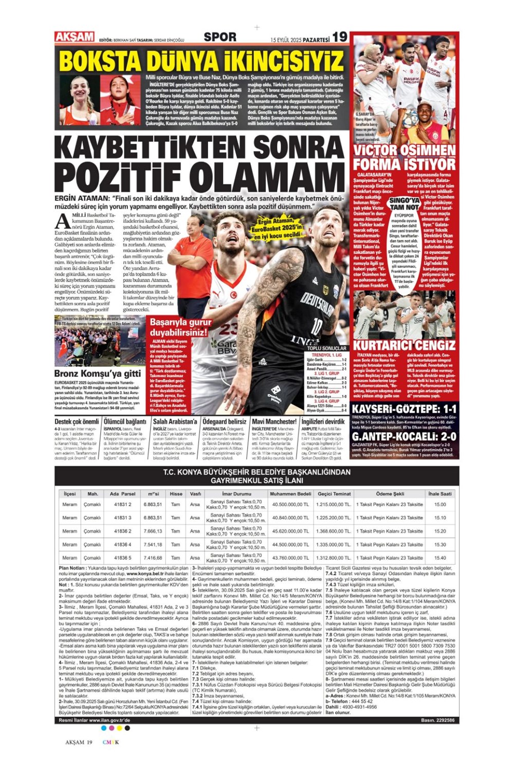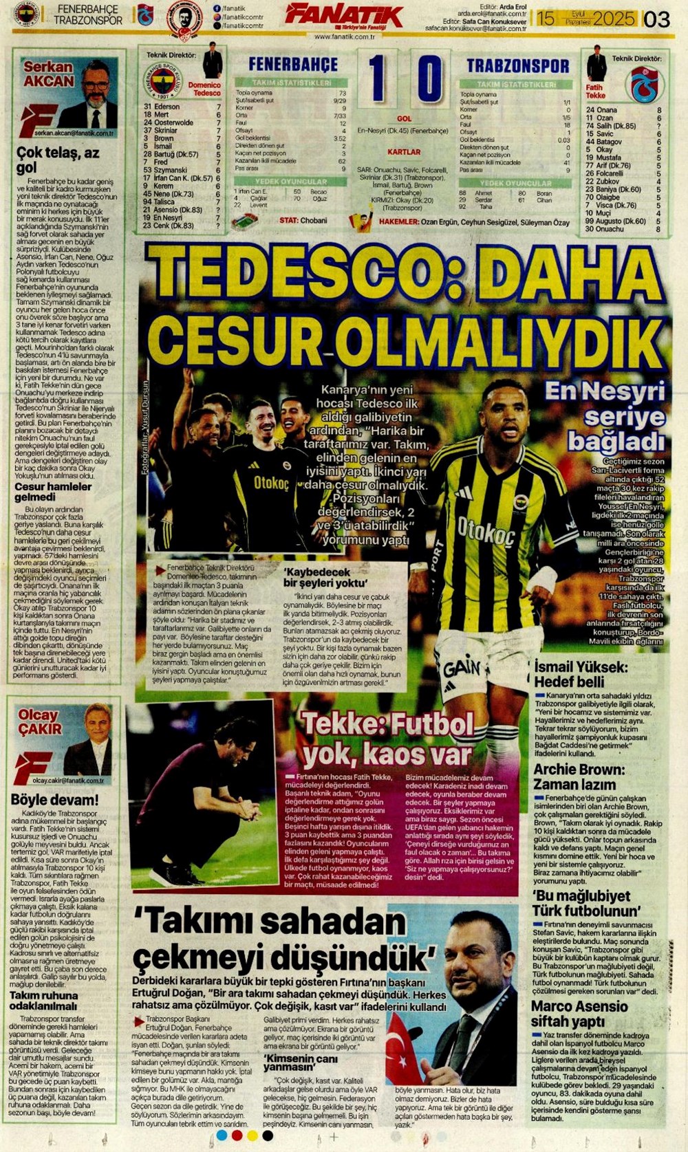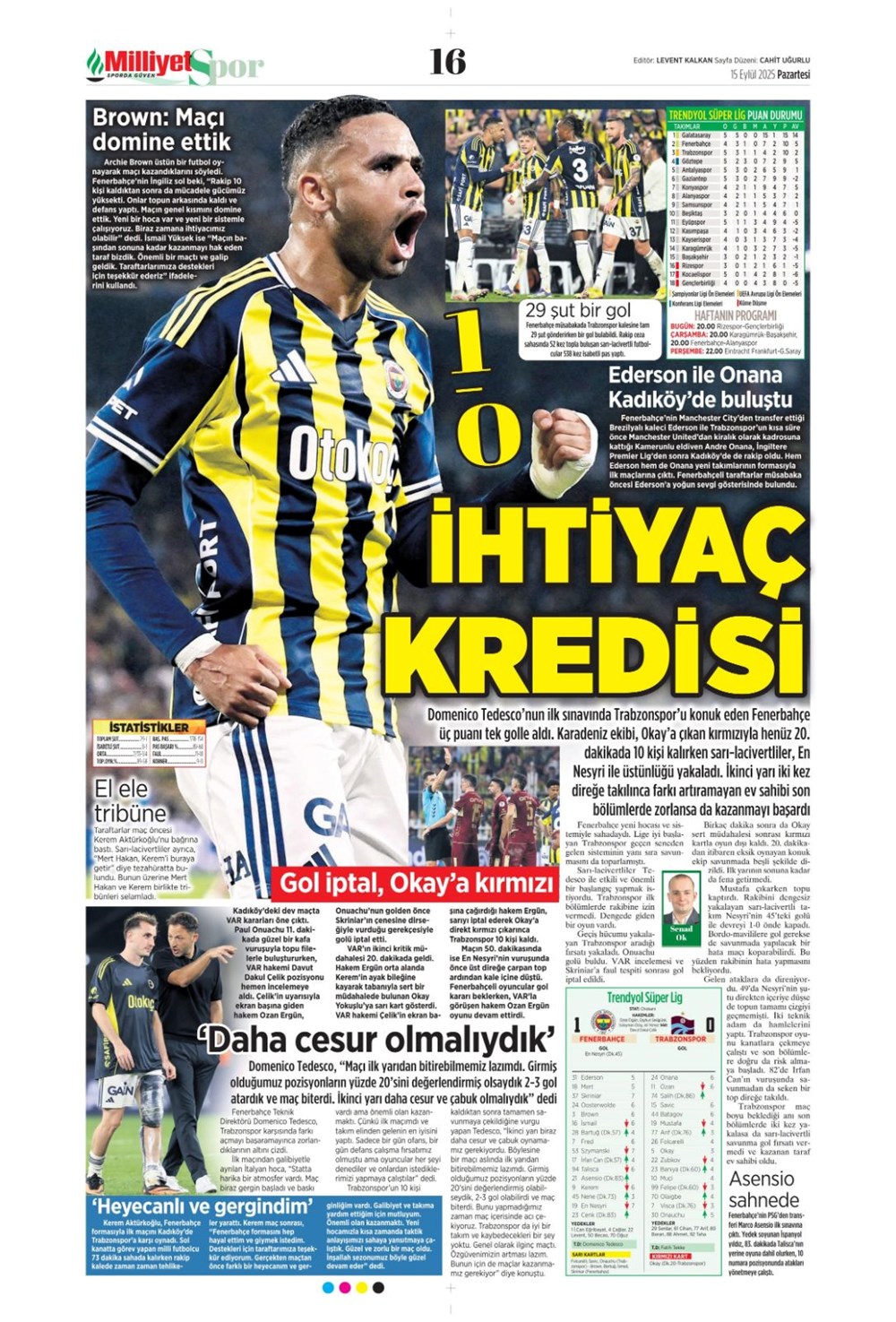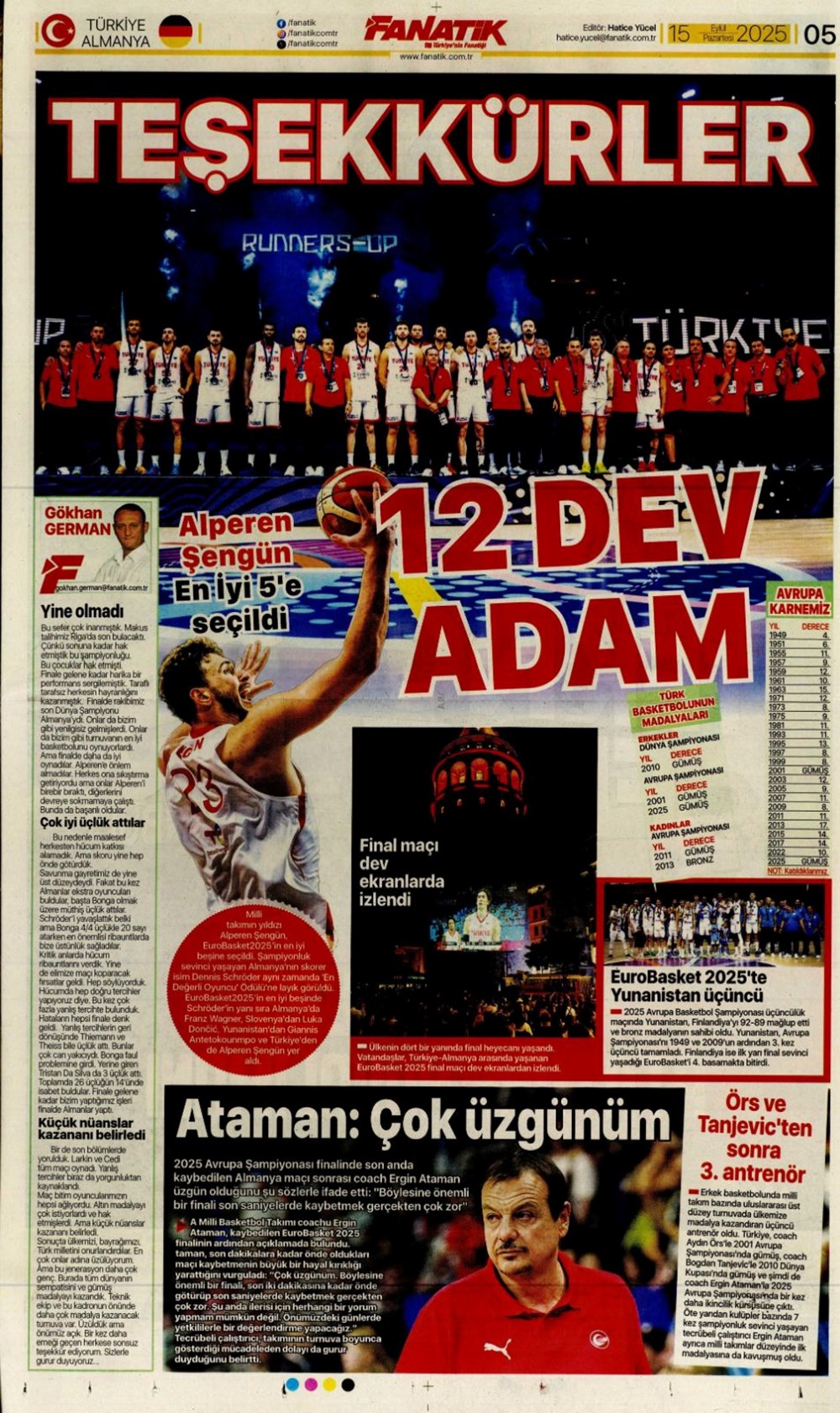 “Kadıköy’de hoşgeldin partisi” (15 Eylül spor manşetleri)