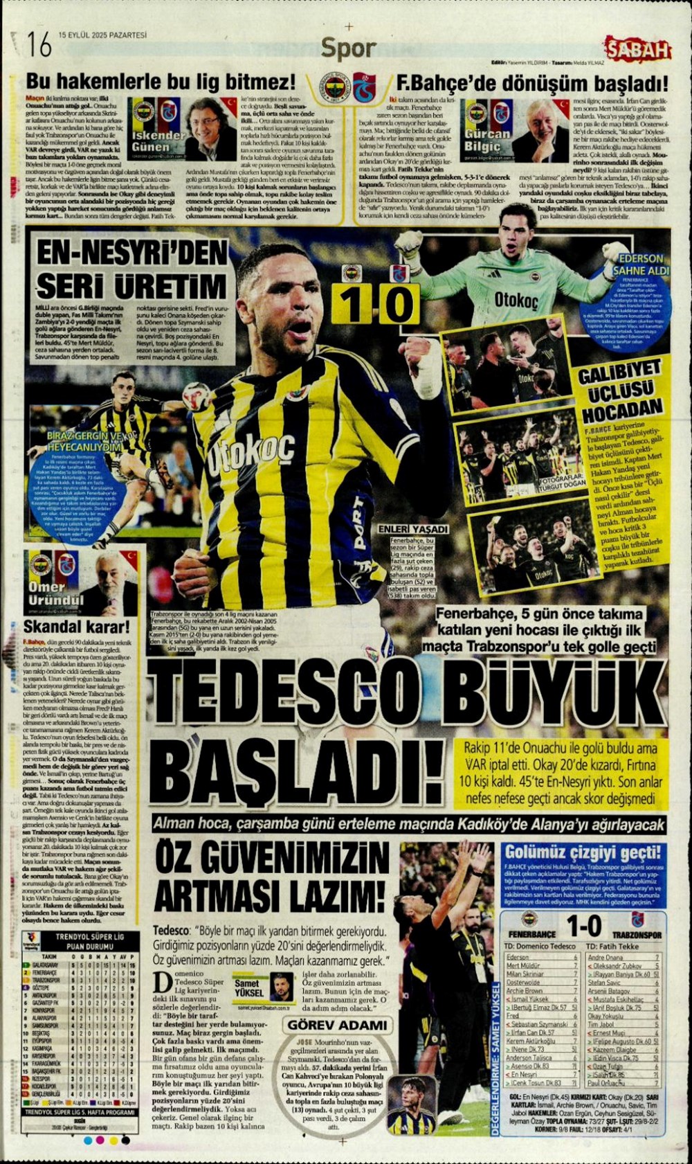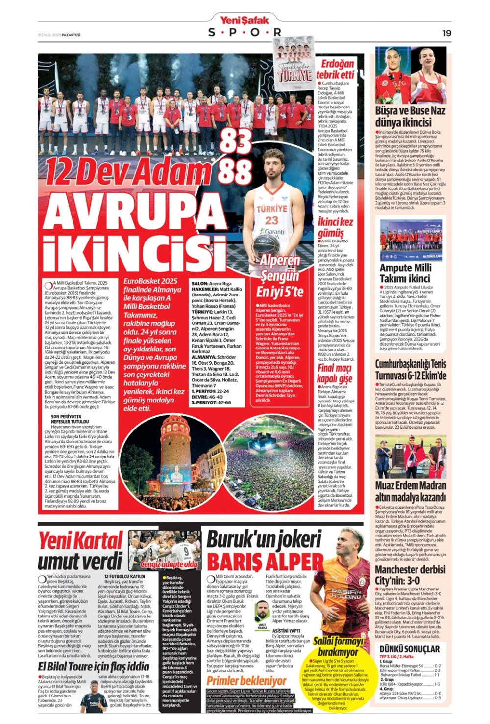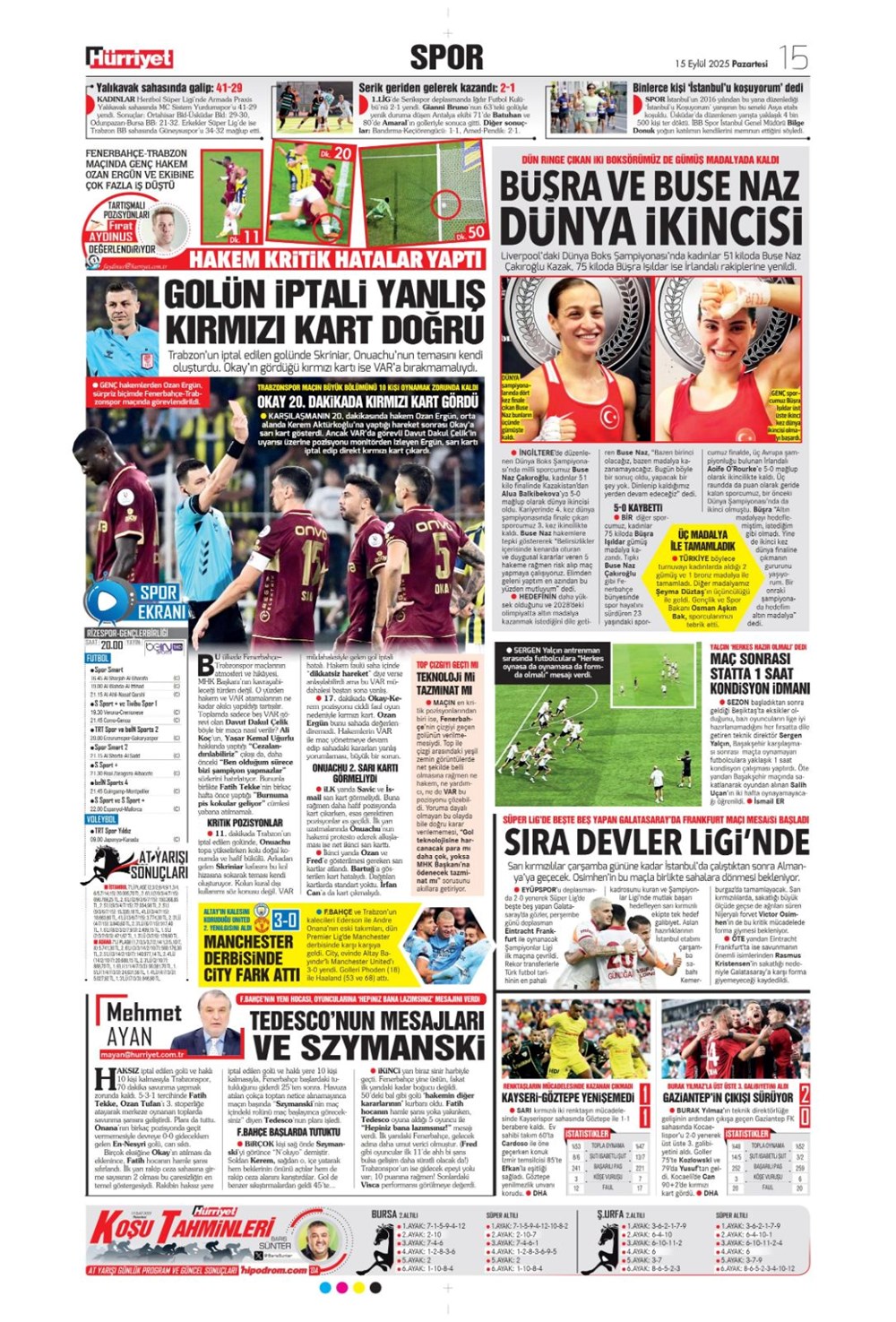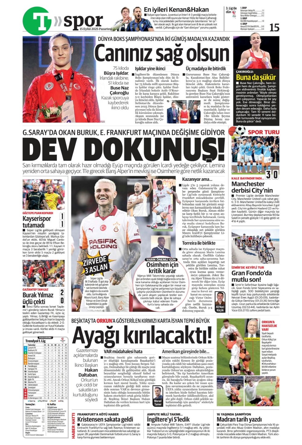 Günün spor manşetlerinde, spor gündeminden en yeni gelişmeler ve transfer haberleri yer aldı. 15 Eylül 2025 tarihli gazetelerin spor sayfalarında Beşiktaş, Fenerbahçe, Galatasaray ve Trabzonspor haberlerine, 1 dakikada göz atın.