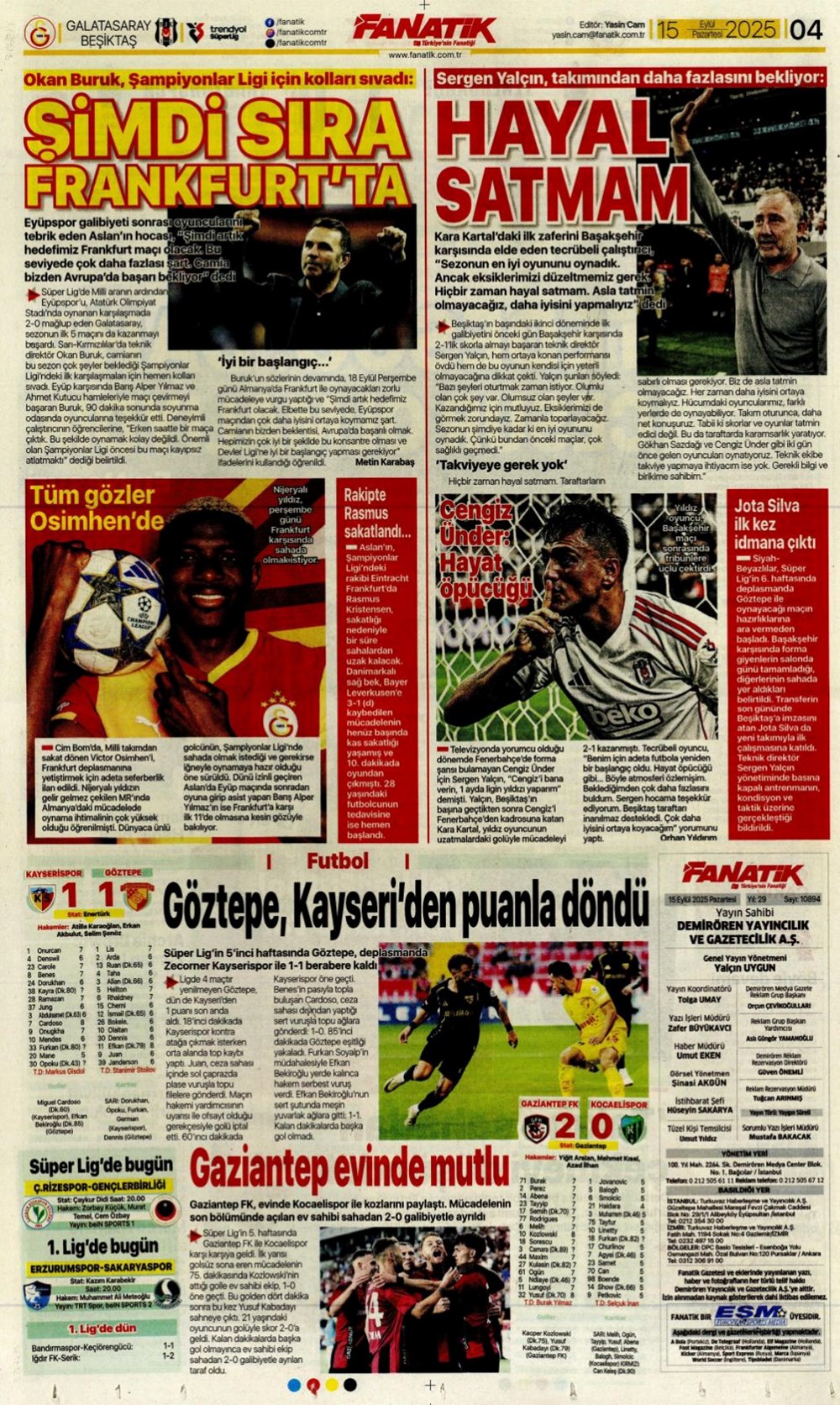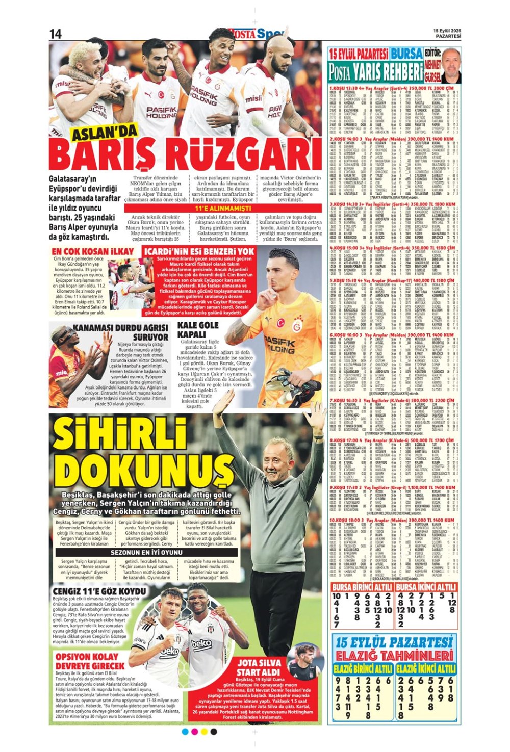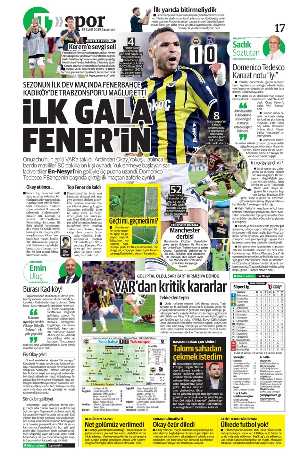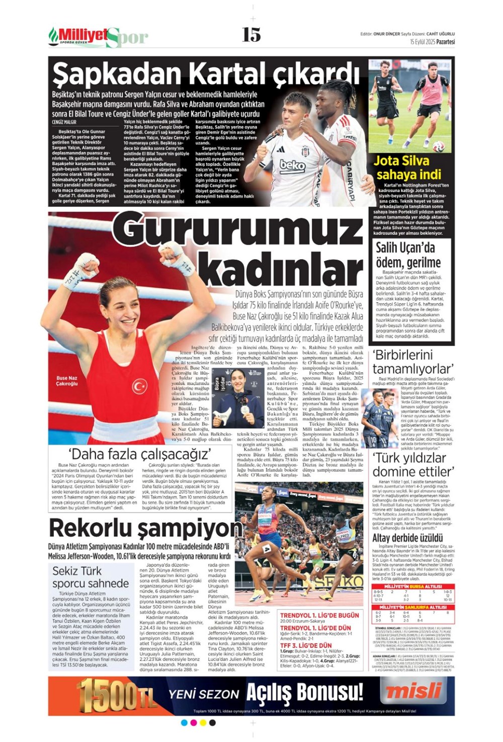 Günün spor manşetlerinde, spor gündeminden en yeni gelişmeler ve transfer haberleri yer aldı. 15 Eylül 2025 tarihli gazetelerin spor sayfalarında Beşiktaş, Fenerbahçe, Galatasaray ve Trabzonspor haberlerine, 1 dakikada göz atın.
