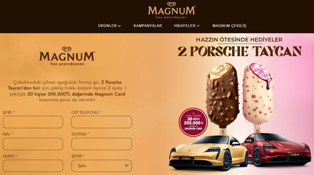 2025 yılı Magnum büyük çekilişi için heyecanlı bekleyiş başladı. Katılımcıların çubuklardan çıkan şifreleri magnum.com.tr adresindeki form aracılığıyla sisteme girmesiyle dahil olduğu kampanyada, yılın en merak edilen ödüllerinden biri olan Porsche Taycan için 1. dönem çekilişi yaklaşıyor.