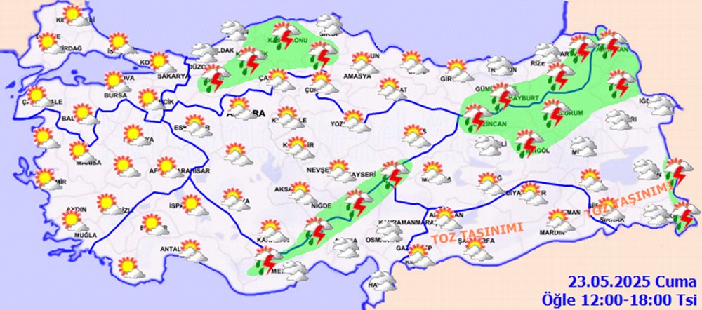 Meteorolojiden yapılan tahminlere göre: yurt genelinin parçalı ve çok bulutlu, Doğu Akdeniz’in Toroslar mevkii, Batı ve Doğu Karadeniz’in iç kesimleri, Erzincan, Bingöl, Erzurum, Iğdır, Kars ve Ardahan çevreleri ile Van’ın ve Hakkari’nin doğu kesimlerinin sağanak ve gök gürültülü sağanak yağışlı geçeceği tahmin ediliyor.