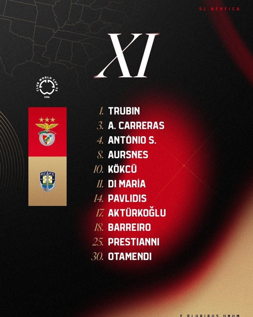 Benfica: Trubin, Kerem, Aursnes, Barreiro, Carreras, Di Maria, Orkun, Otamendi, Pavlidis, Prestianni, Silva