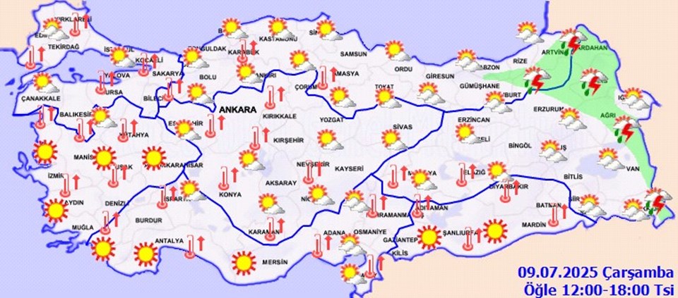 Trabzon, Rize, Artvin, Van ve Hakkari’nin doğusu ile Kars, Ardahan, Ağrı çevrelerinde sağanak yağış görülecek.