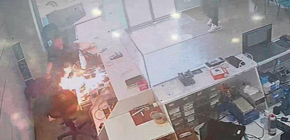 Telefon bataryasının patlama anı böyle görüntülendi. Yangın kısa sürede söndürülürken, iş yerinde küçük çapta hasar oluştu.