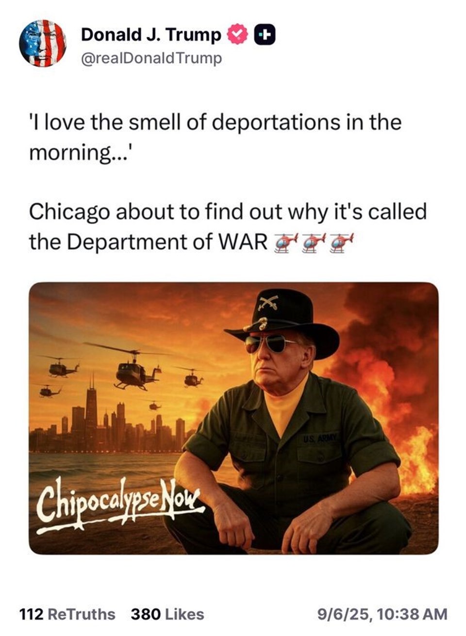 Trump yapay zekayla oluşturulan görsel paylaştı. Görselde ayrıca, Chicago’nun gökdelenleri üzerinde uçan 5 helikopter, ateş ve duman görüntüsü yer aldı.
