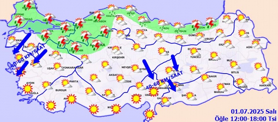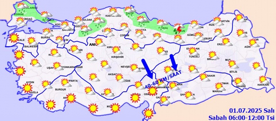Rüzgarın genellikle kuzey yönlerden hafif, ara sıra orta kuvvette, Marmara’nın güneybatısı, Kuzey Ege kıyıları, Doğu Anadolu’nun güneybatısı ile Kahramanmaraş ve Adıyaman çevrelerinde kuzey yönlerden kuvvetli ve fırtına (40-80 km/saat) şeklinde eseceği tahmin ediliyor.